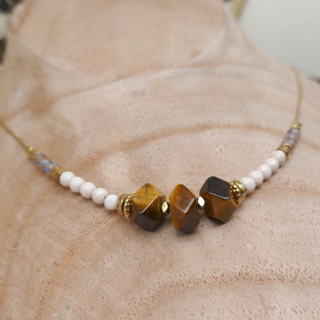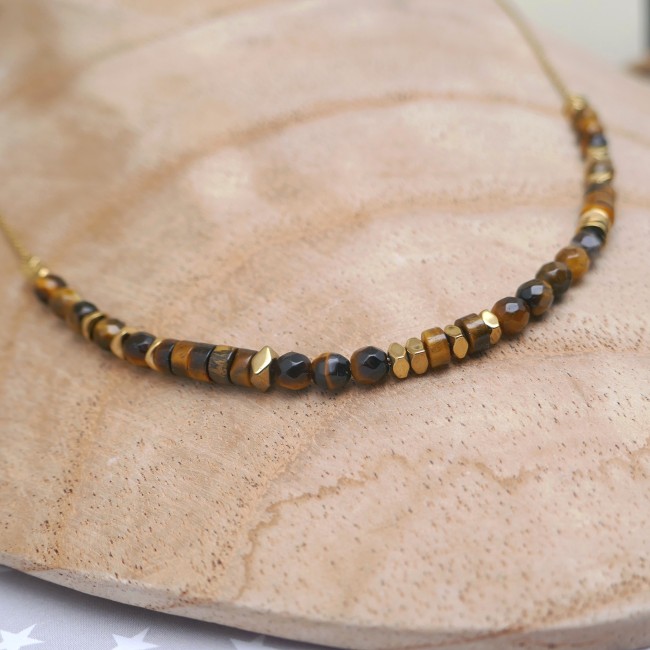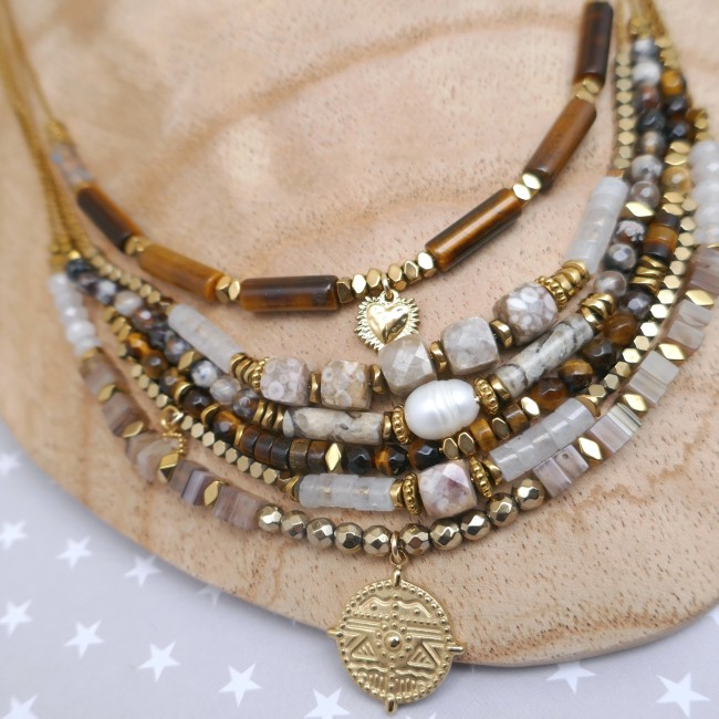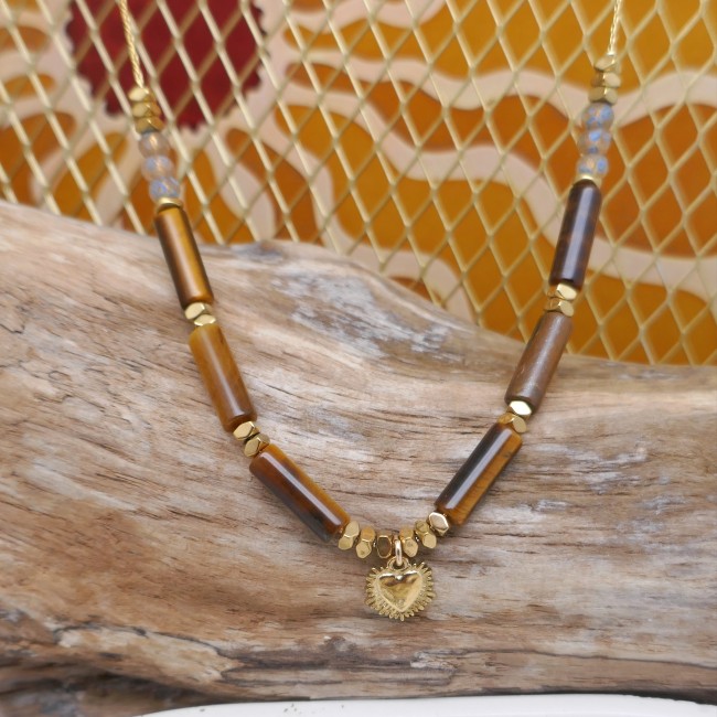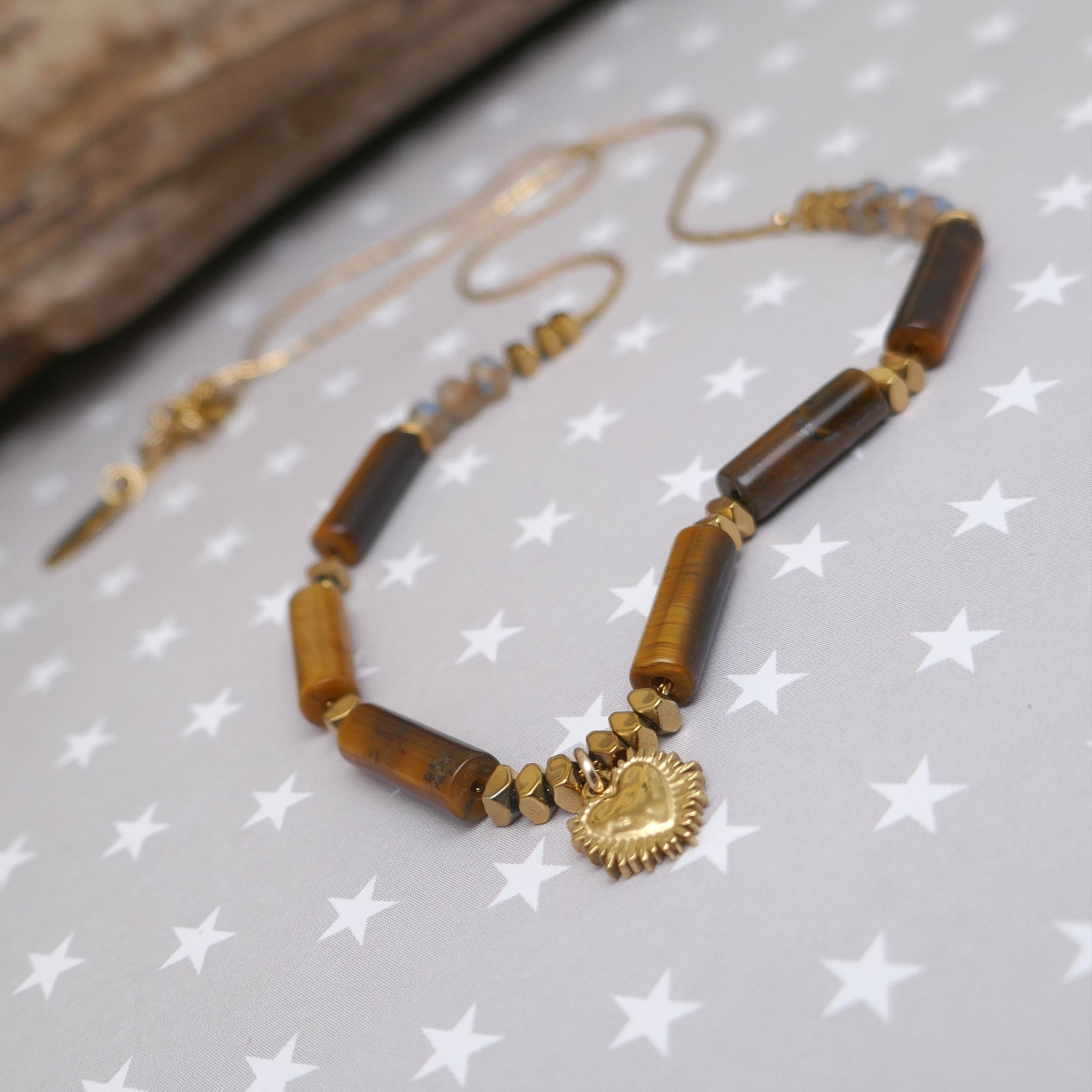 _ Mix de perles et intercalaires en hématite et acier, perles en verre facetté, tubes en oeil de tigre, petit coeur en acier... Chaque perle / pierre étant unique, il peut y avoir de légères différences.