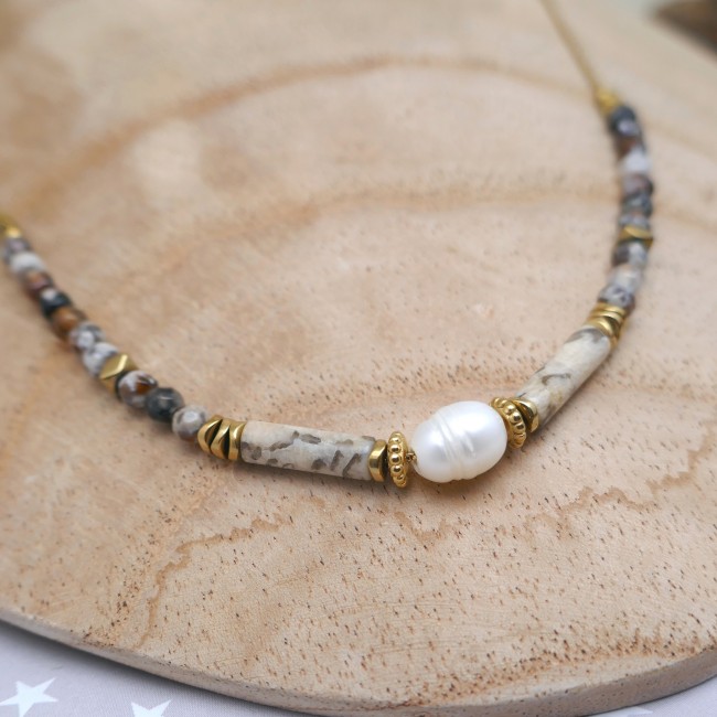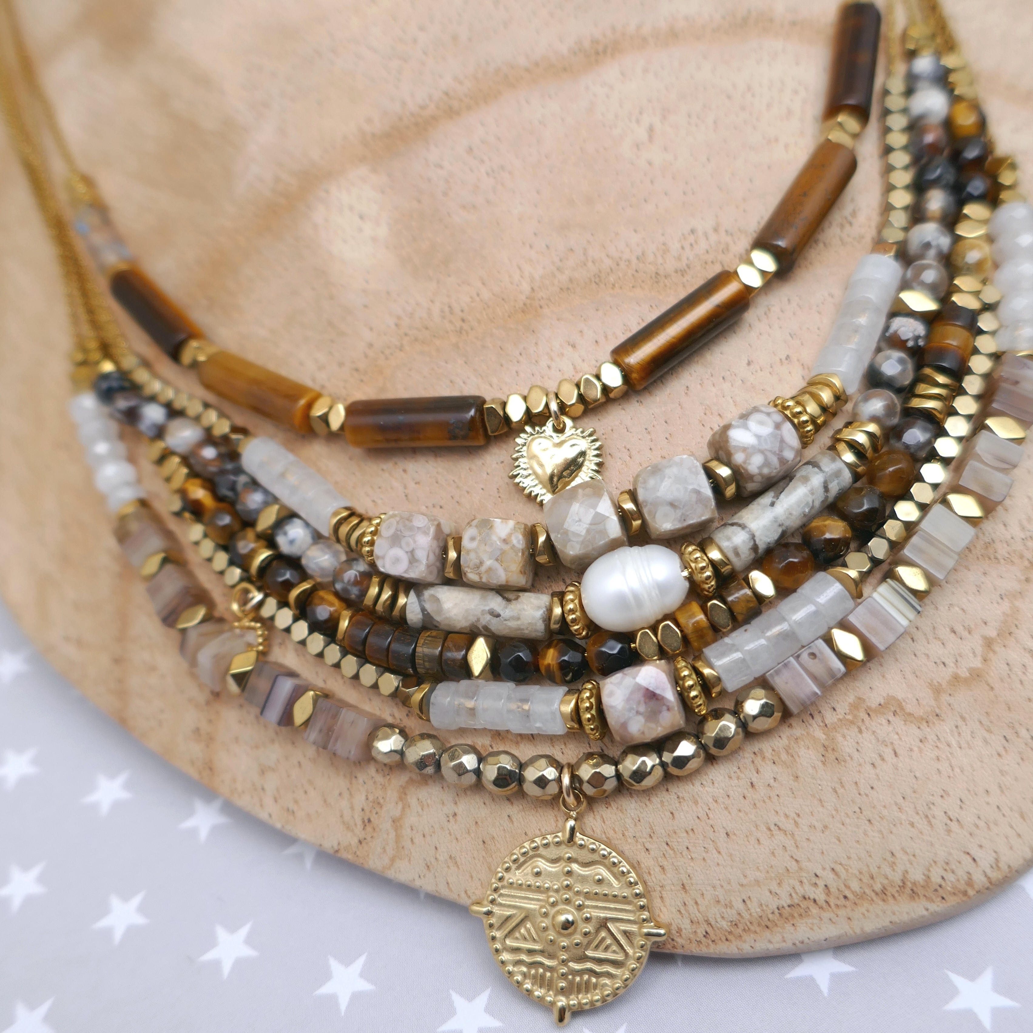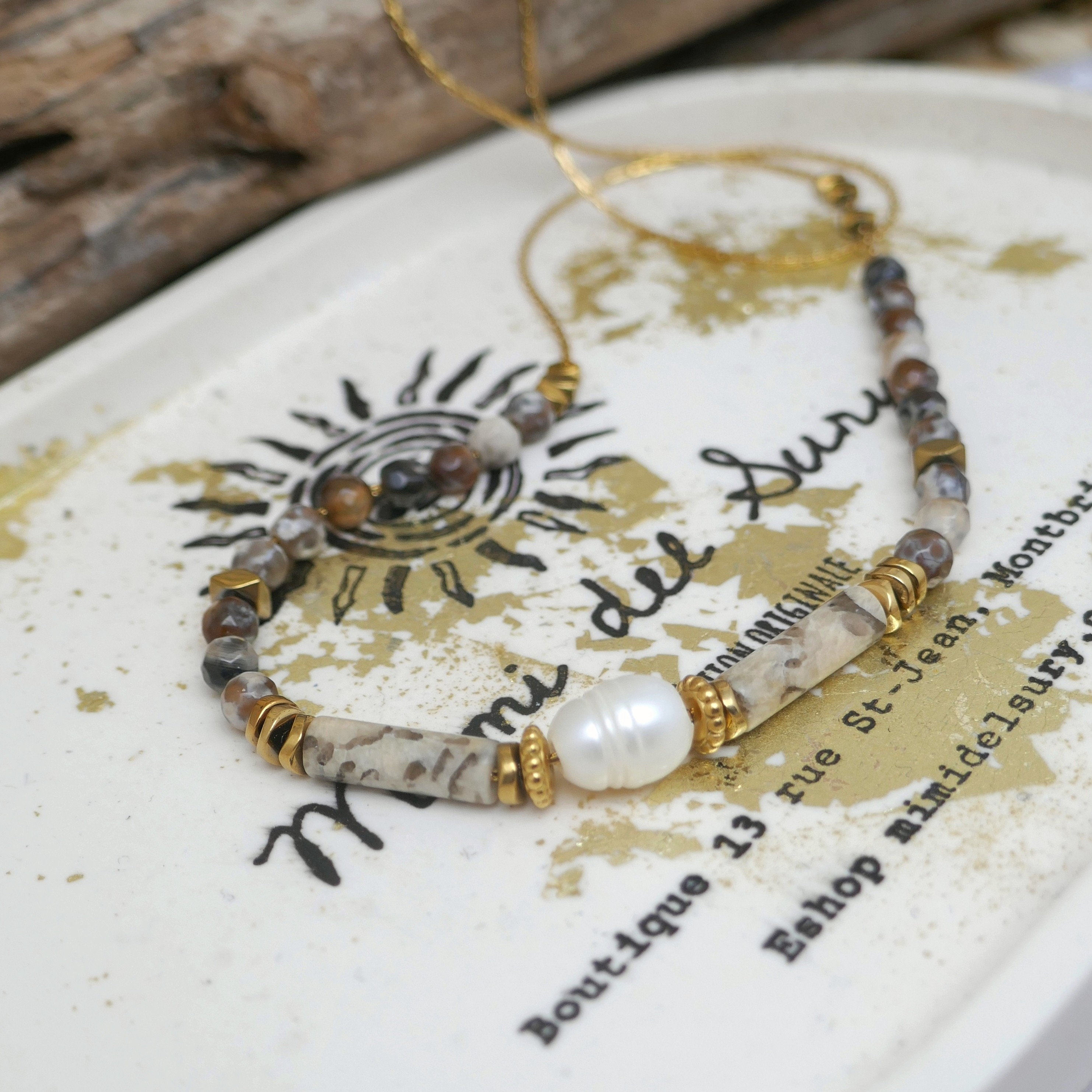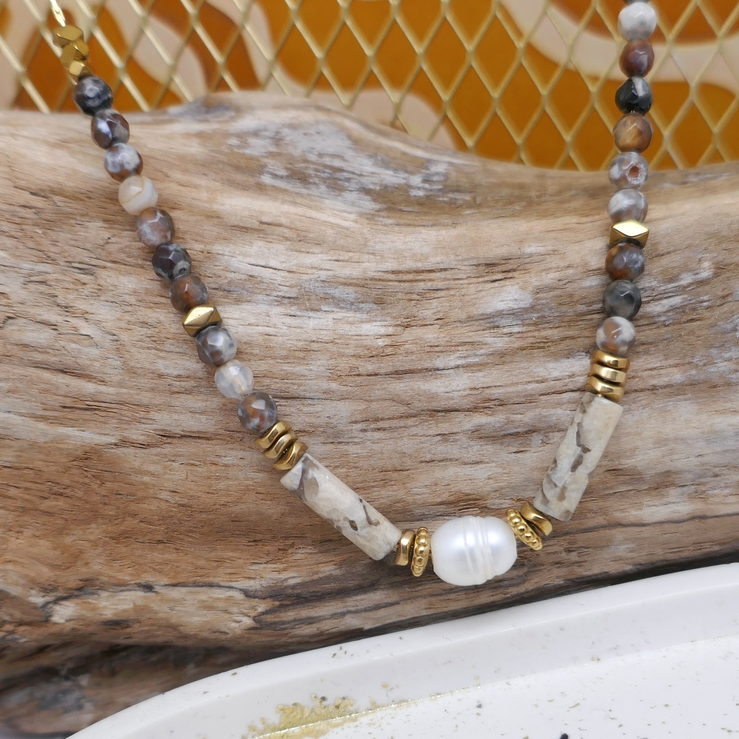 _ Mix de perles et intercalaires en hématite et acier, petites perles à facettes en agate, tubes feldspath, perle d'eau douce... Chaque perle / pierre étant unique, il peut y avoir de légères différences.