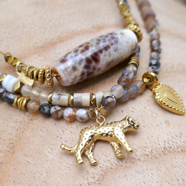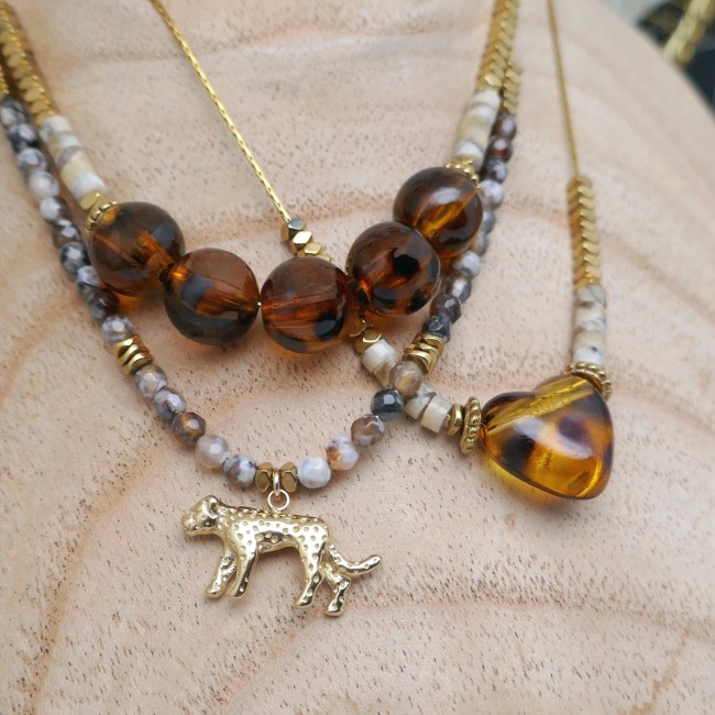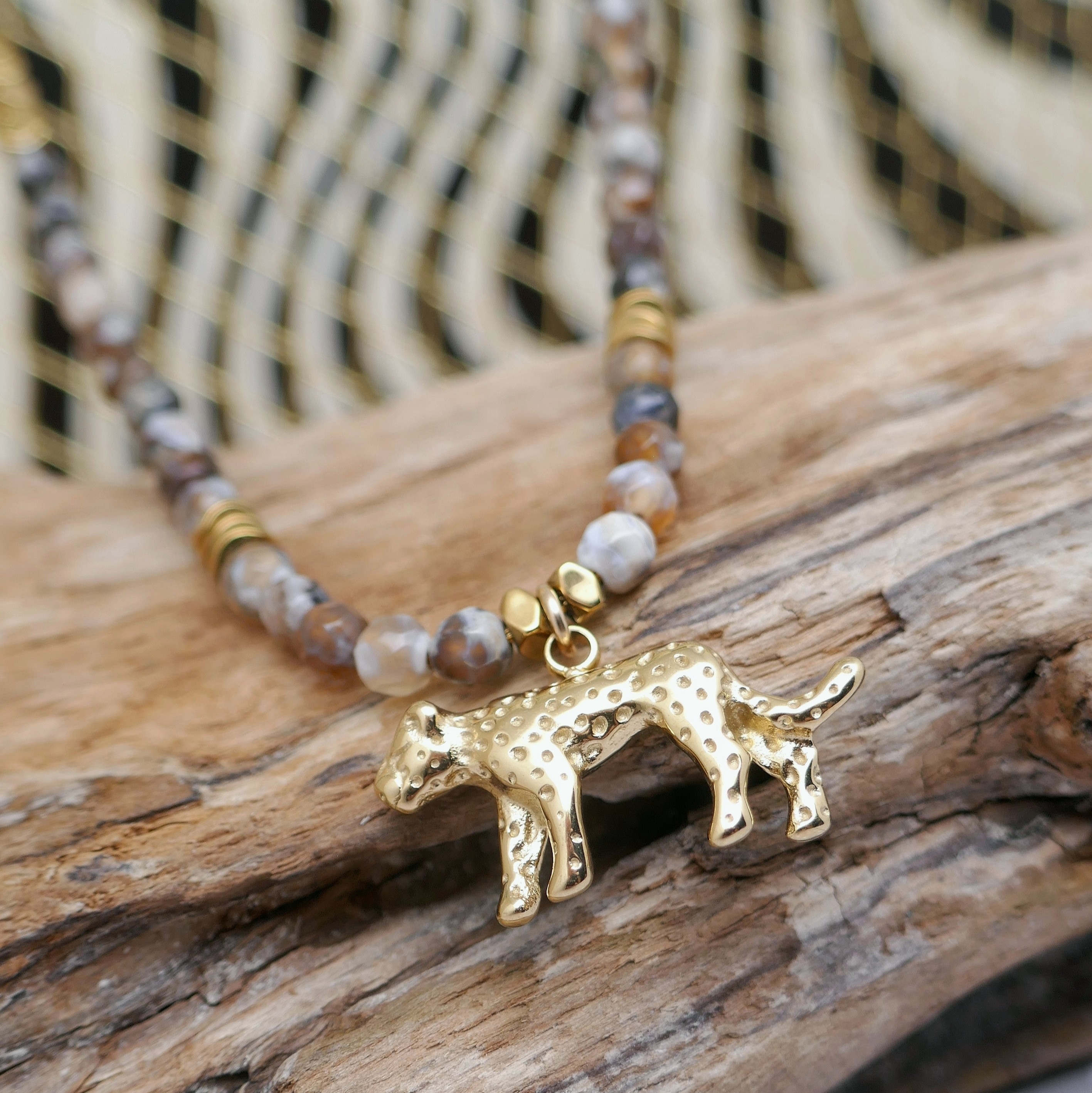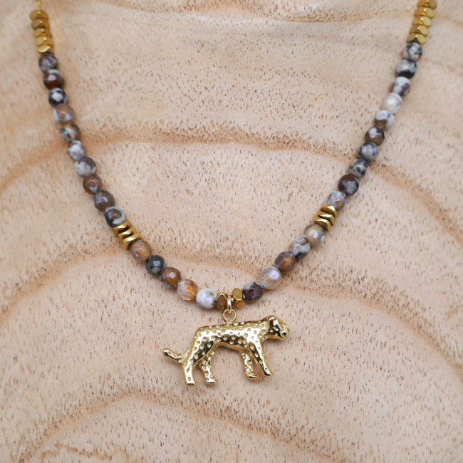 _ Collier en acier inoxydable: chaîne fine longueur 42cm, pendentif léopard, fermoir bouée en Gold filled + chaînette de rallonge, breloque signature Mimi del Sury.