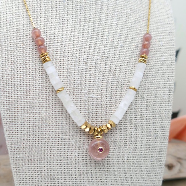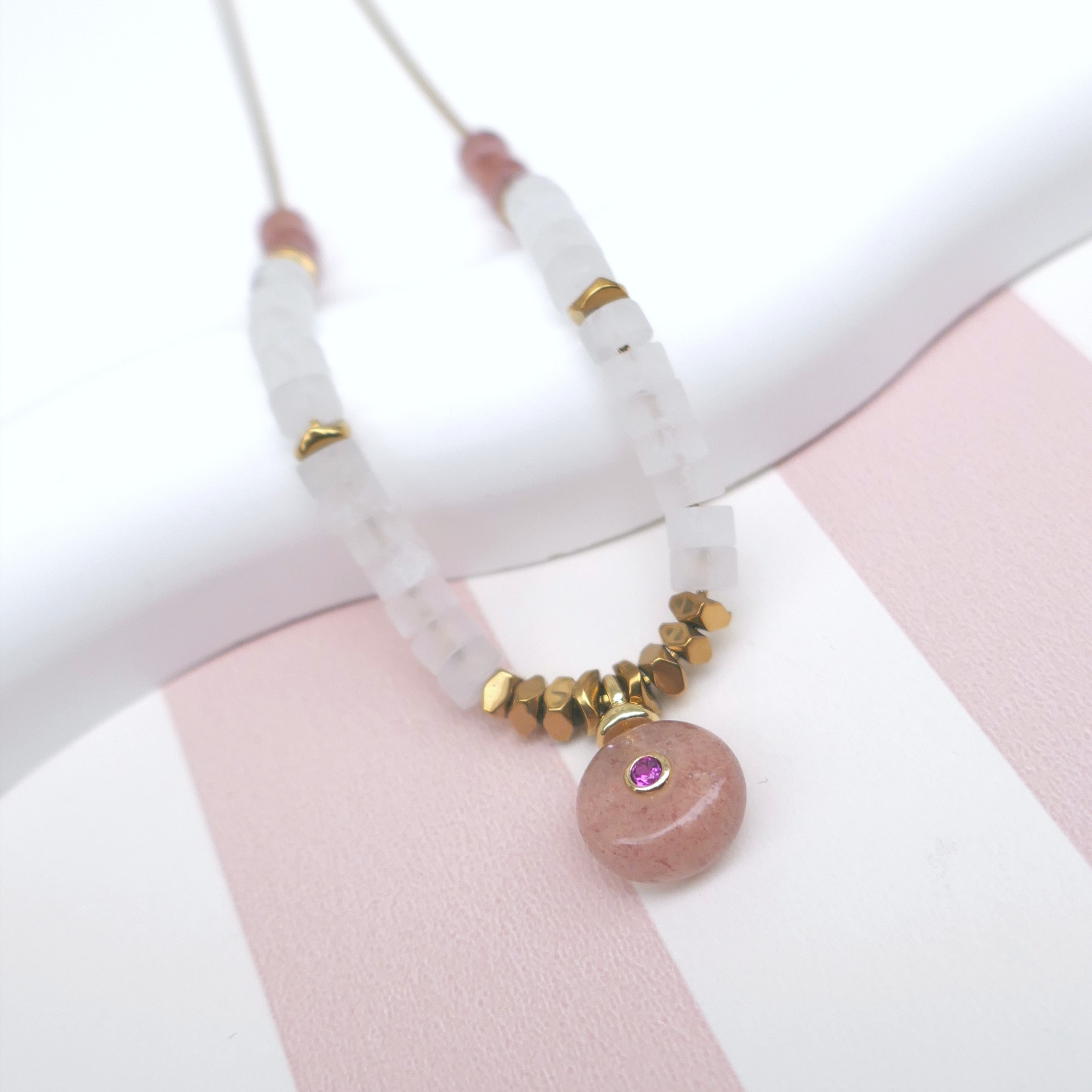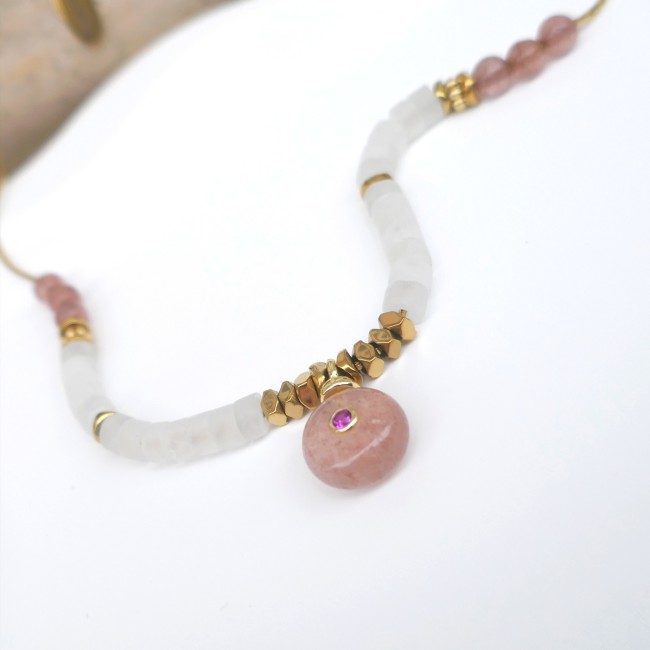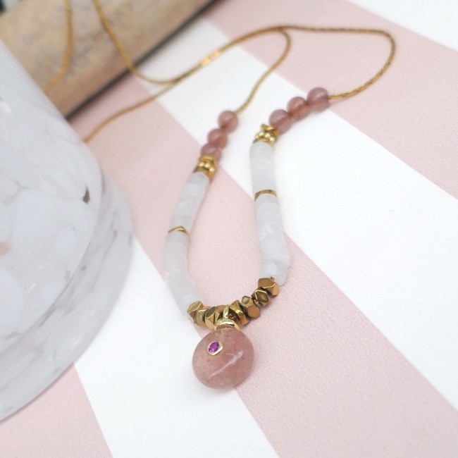 _ Pendentif pierre en quartz fraise, intercalaires en hématite, chaîne très fine (longueur 42cm), fermoir mousqueton + chaînette de rallonge + breloque signature Mimi del Sury. Chaîne et apprêts en acier inoxydable doré.