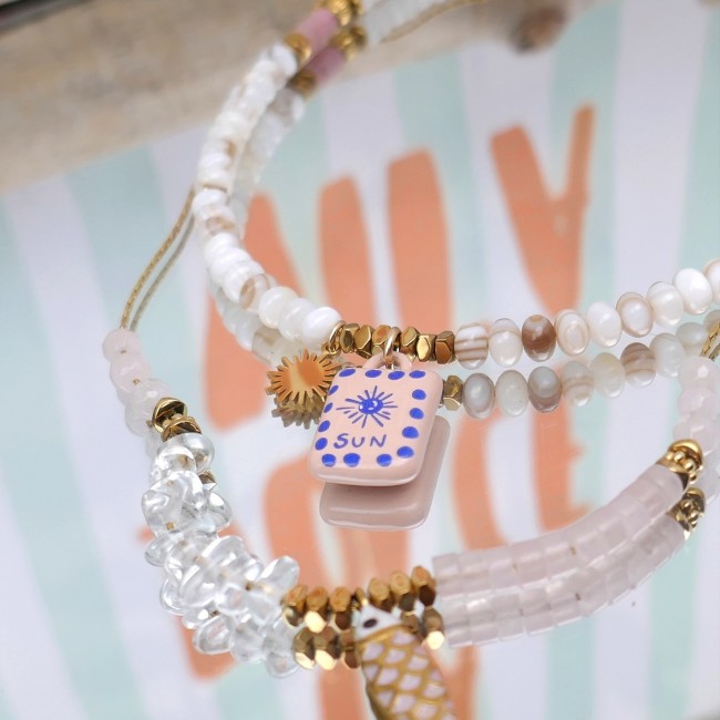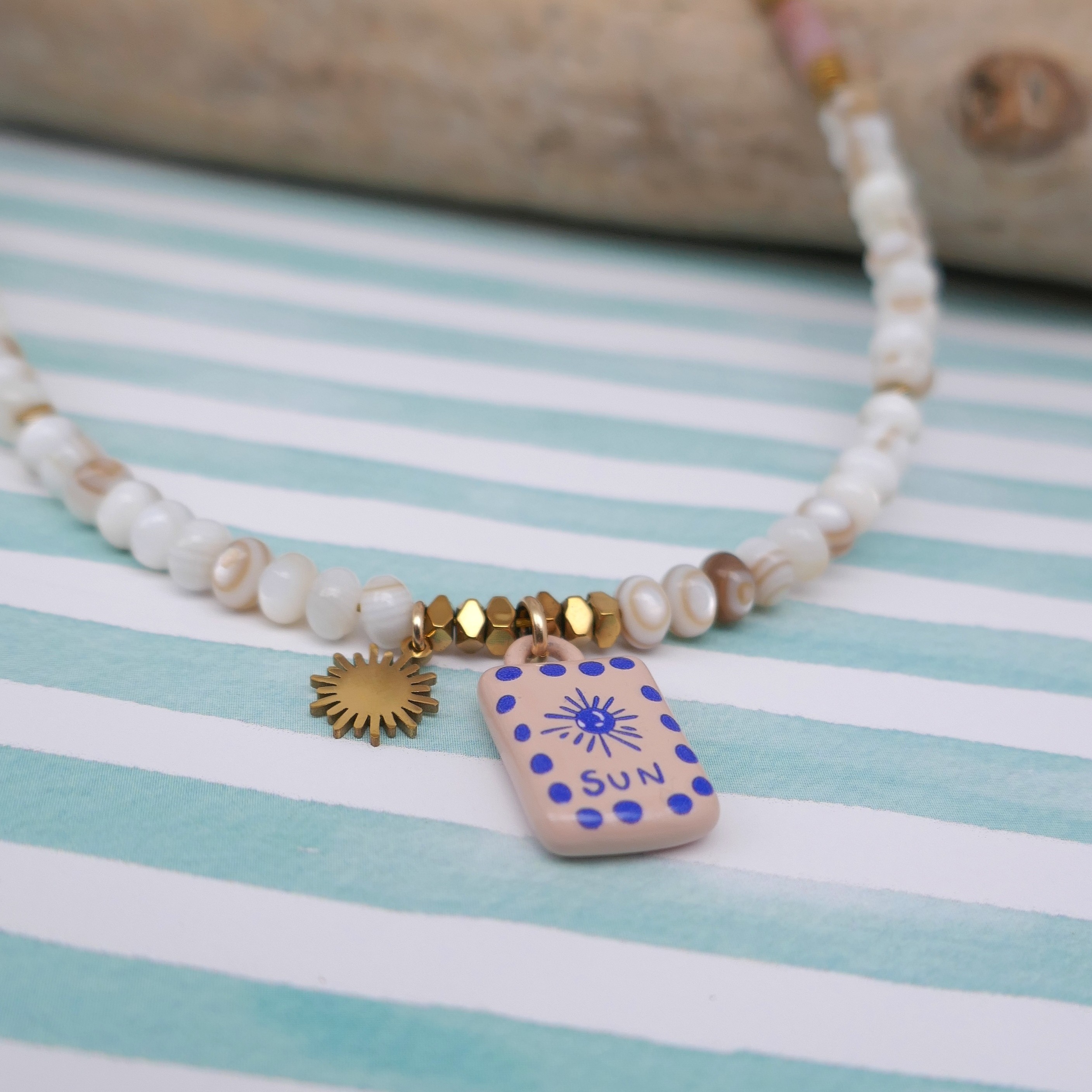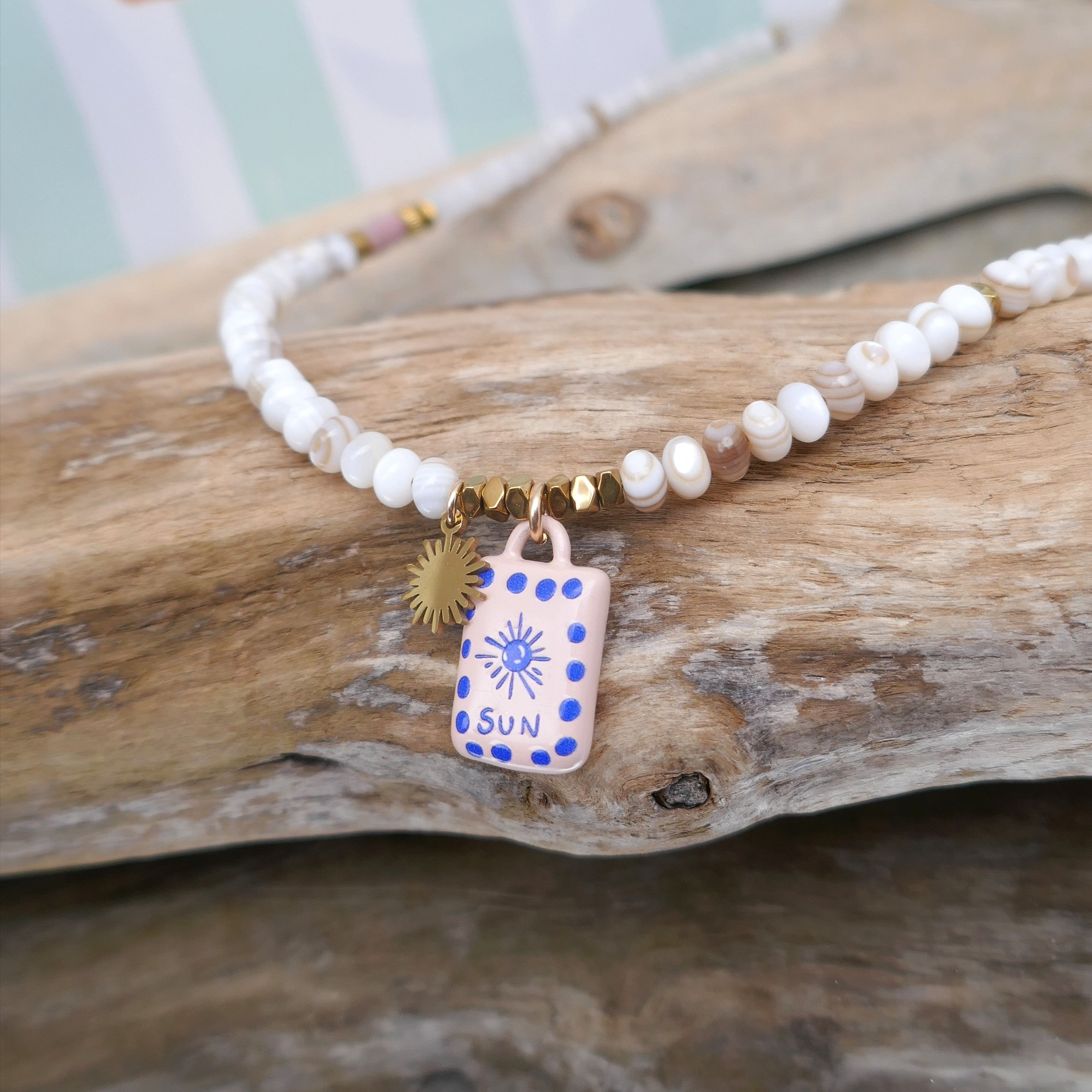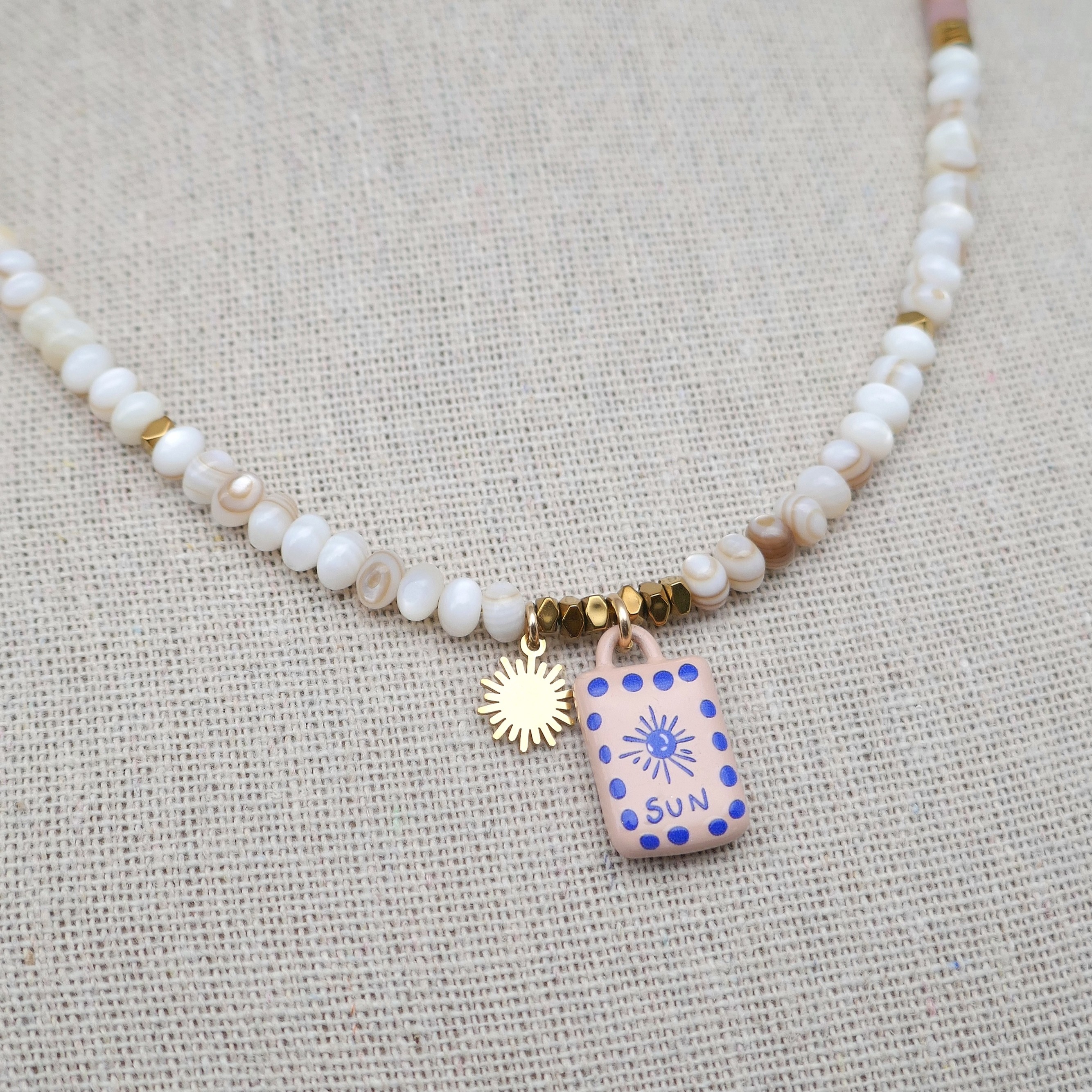 _ Deux pendentifs: "Sun" émaillé rose et bleu + petit soleil.
