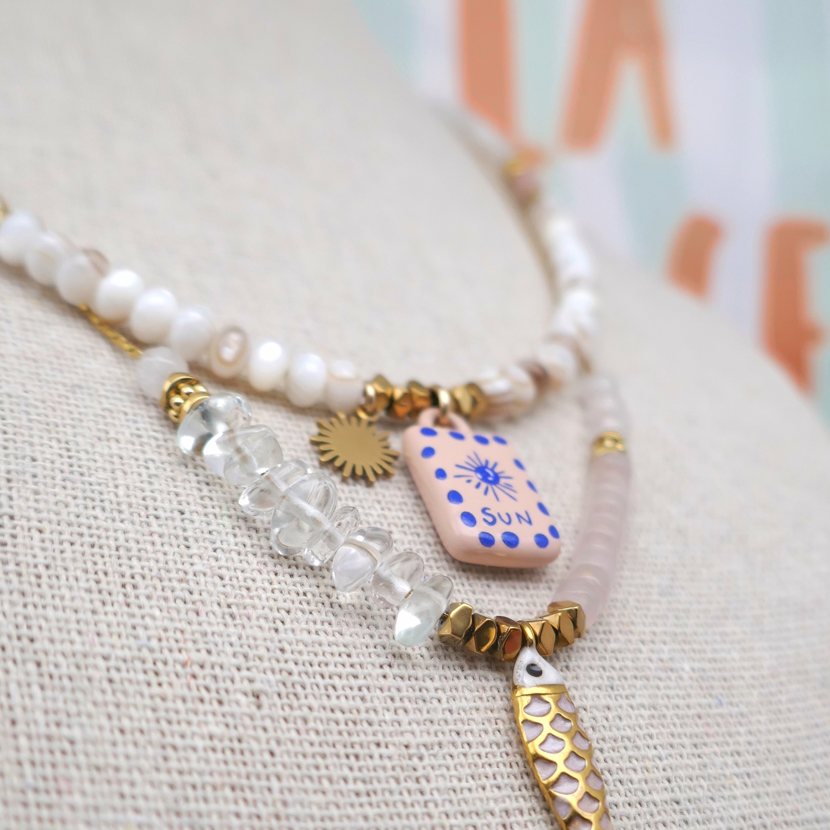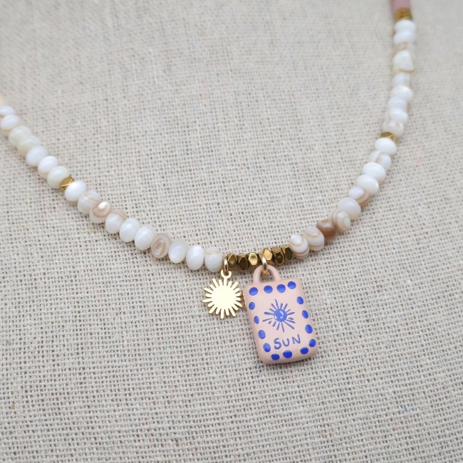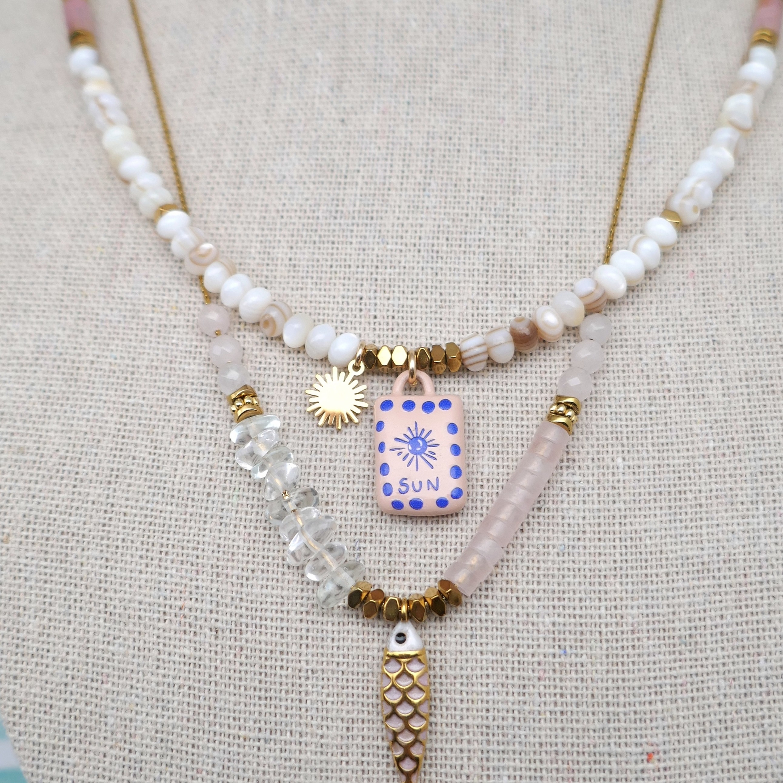 _Collier monté sur câble (tour de cou 42cm) ; fermoir mousqueton + chaînette de rallonge + breloque signature Mimi del Sury. Apprêts en acier inoxydable.
