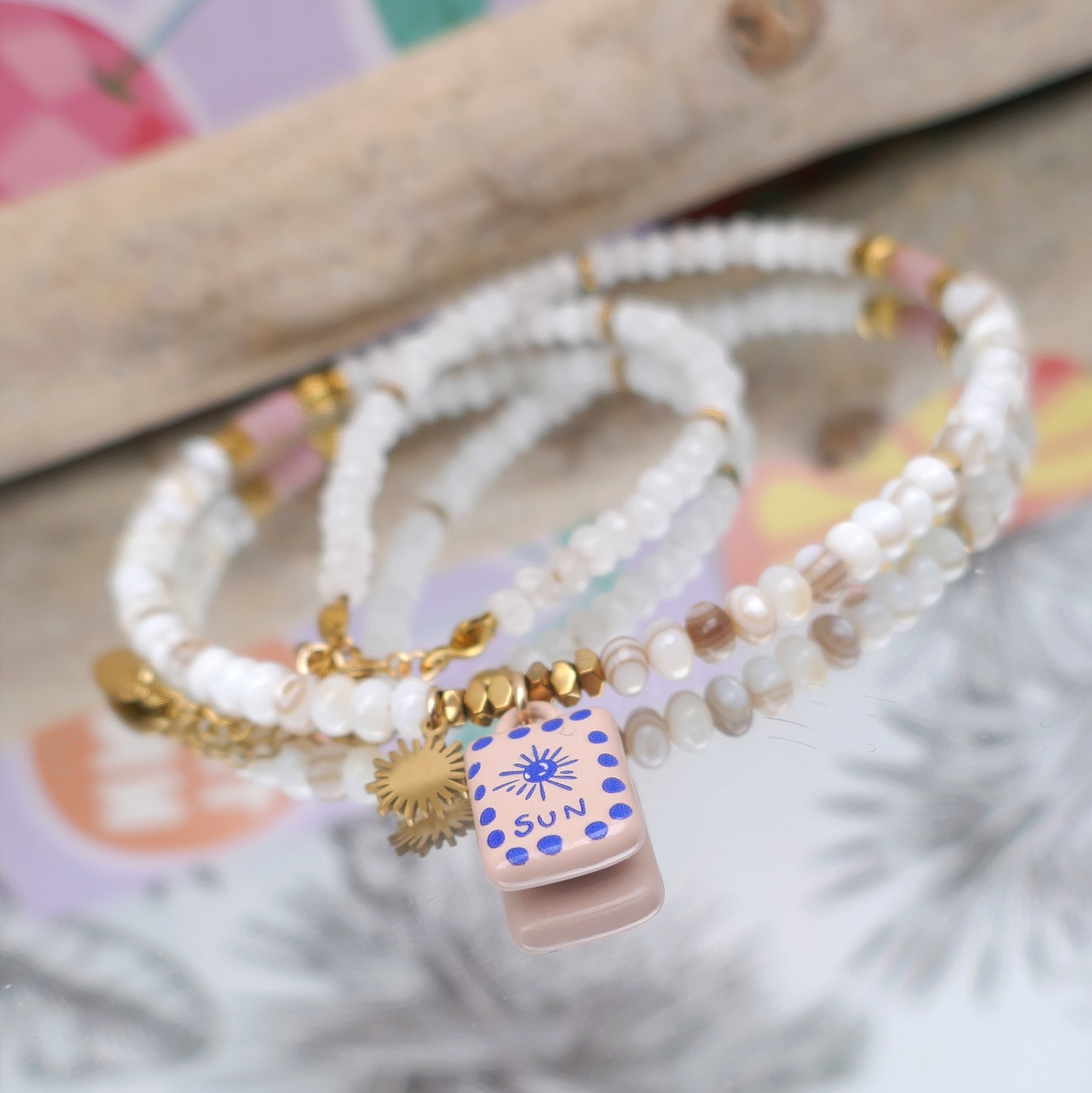 _ Mix de perles facettées en jade, coquillage, heishi rhodonite, intercalaires hématite...Chaque perle / pierre étant unique, il peut y avoir de légères différences.