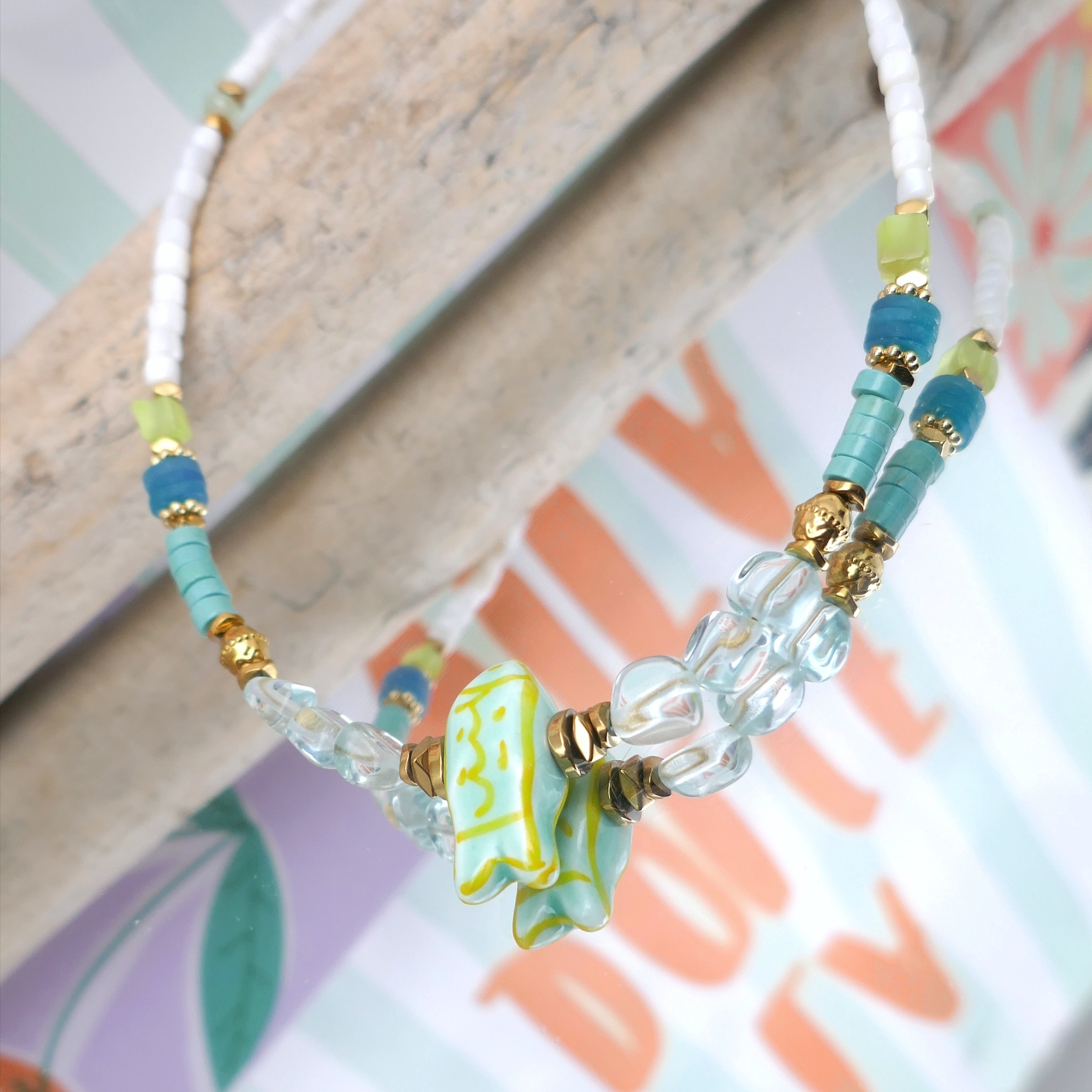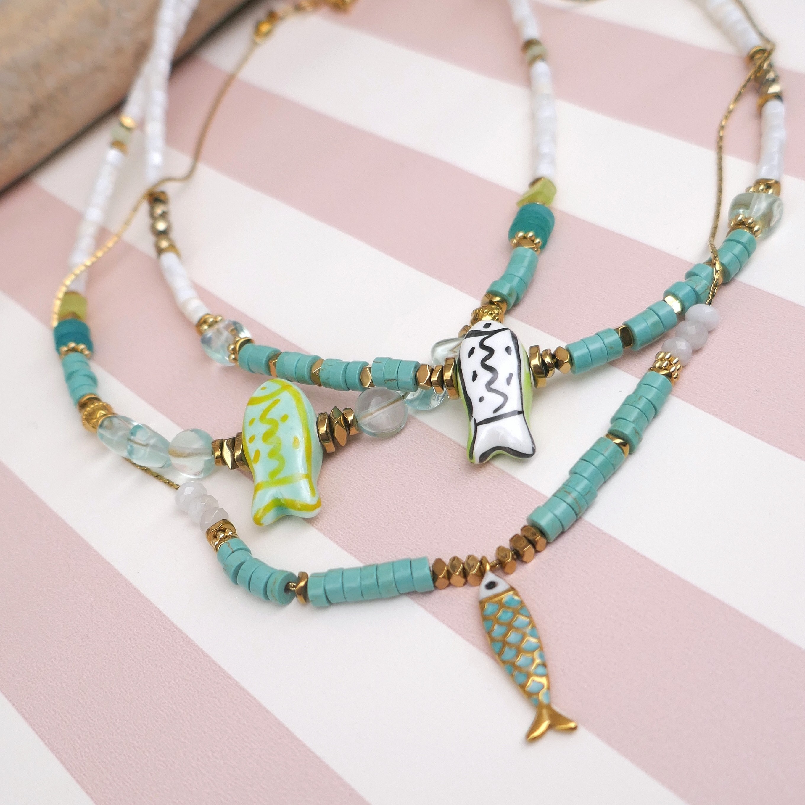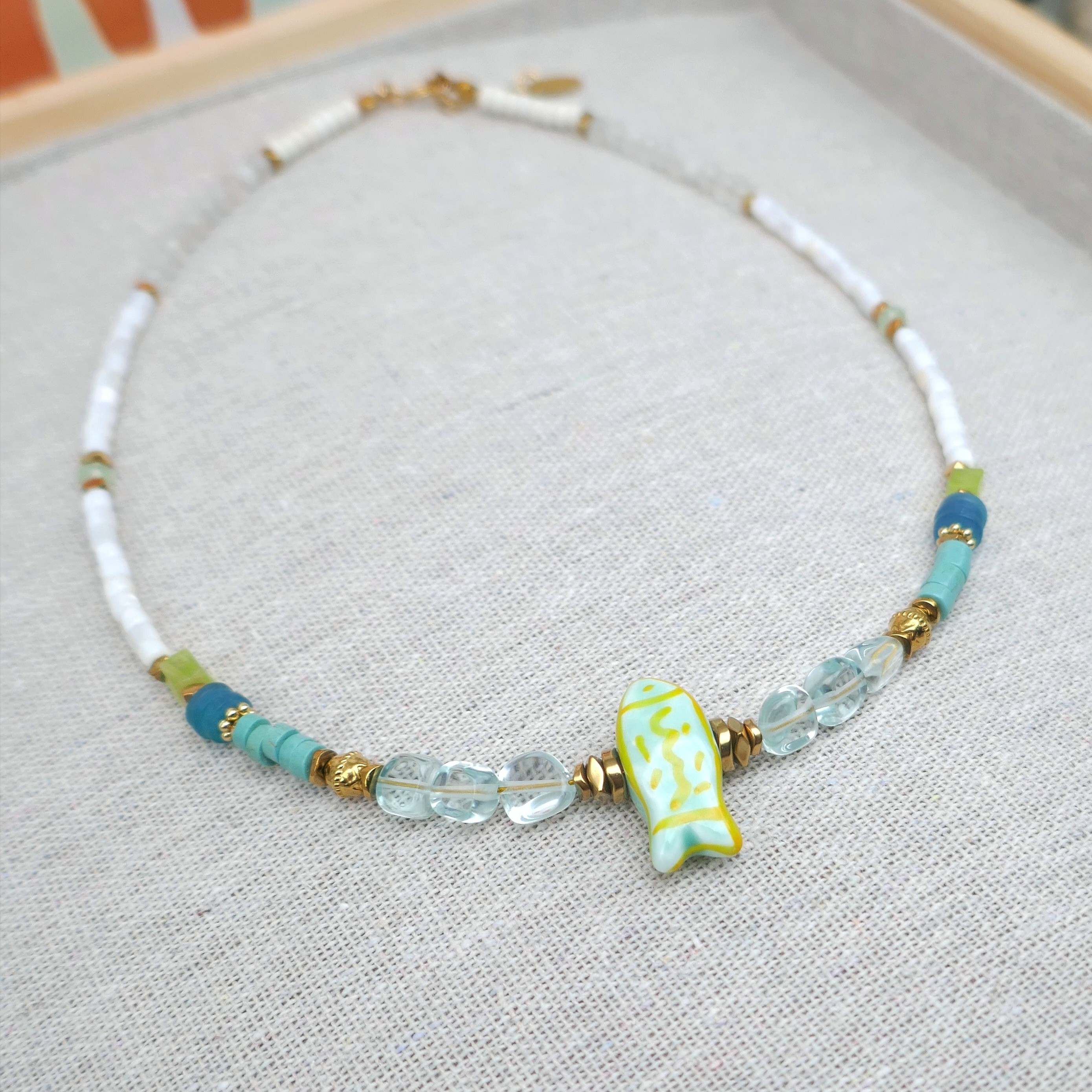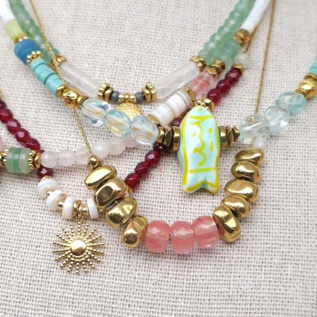 _ Mix de perles facettées en jade, coquillage, verre, heishi howlite...Poisson en céramique, intercalaires en hématite et acier... Chaque perle / pierre étant unique, il peut y avoir de légères différences.