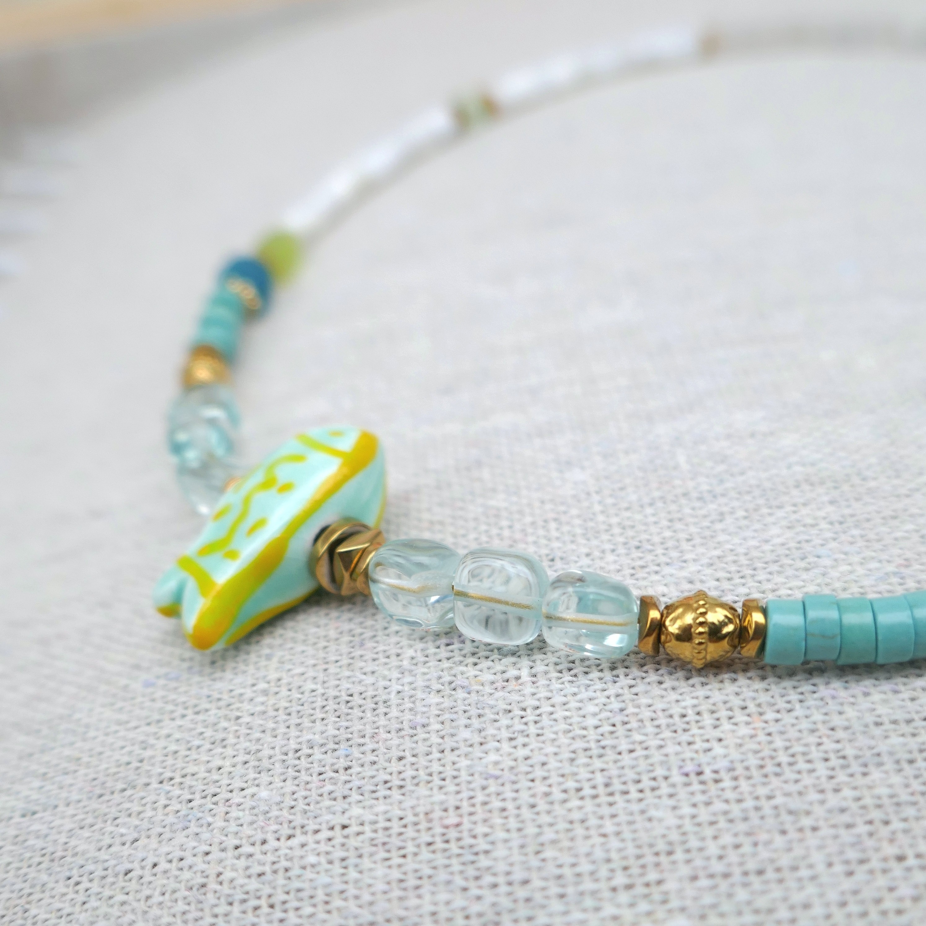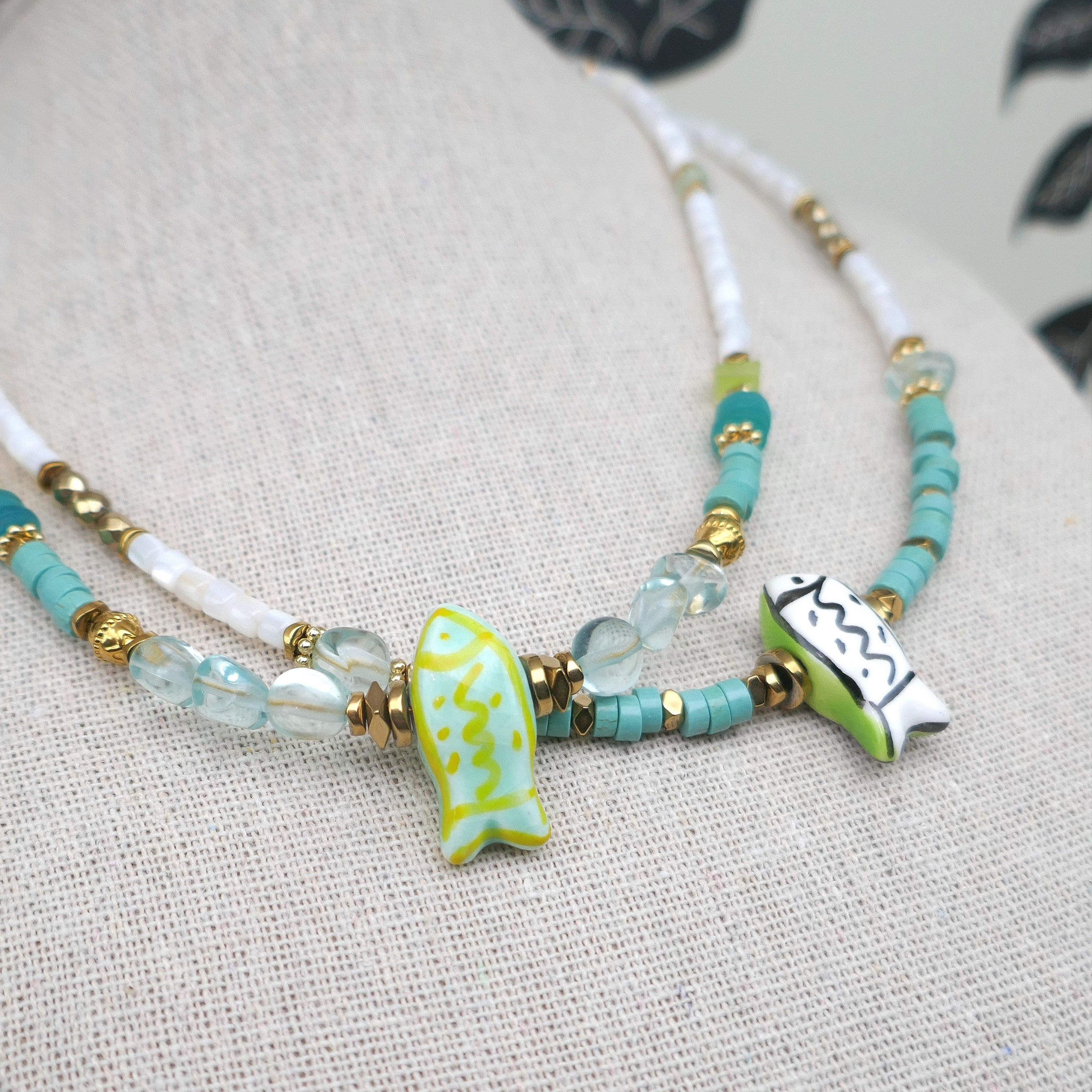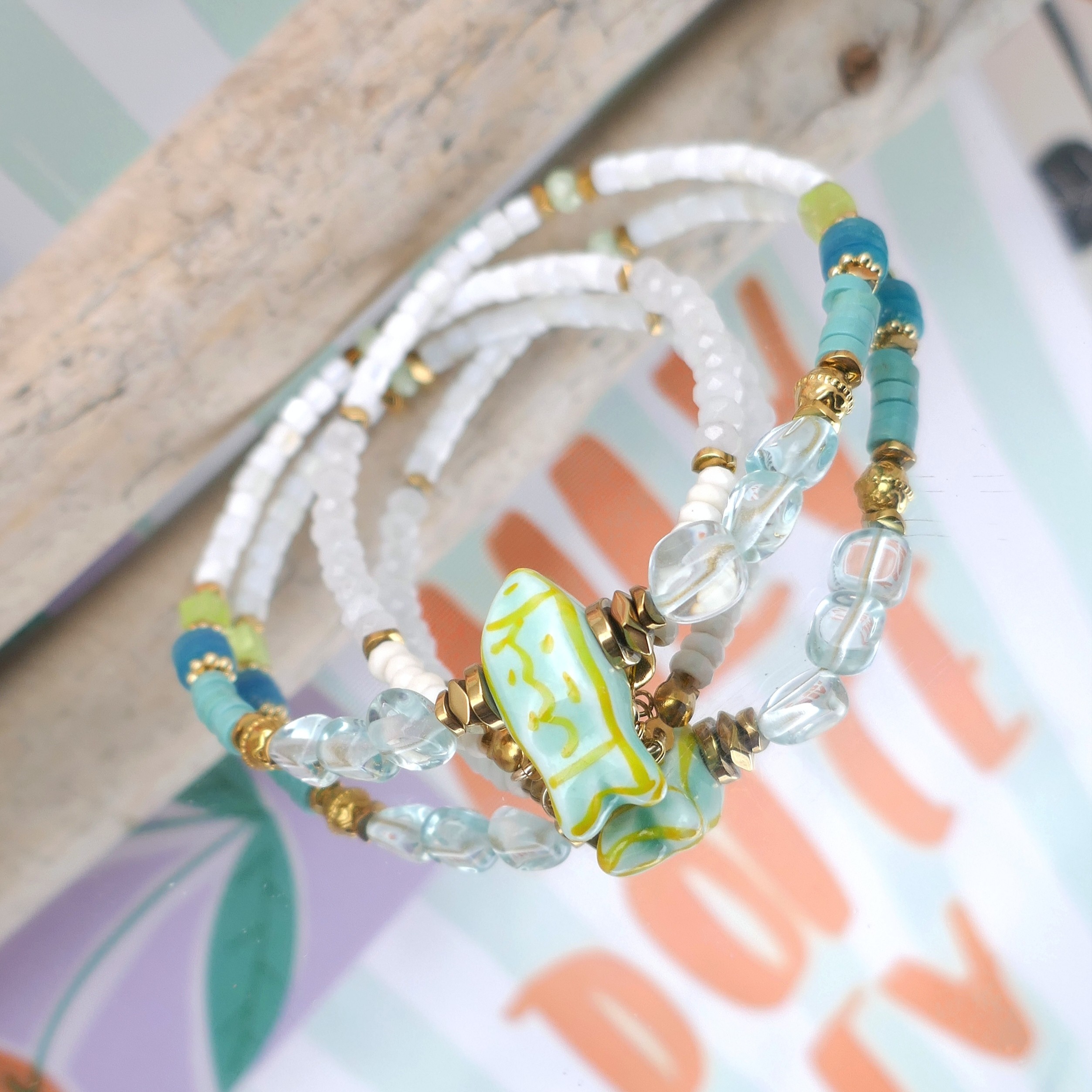 _ Mix de perles facettées en jade, coquillage, verre, heishi howlite...Poisson en céramique, intercalaires en hématite et acier... Chaque perle / pierre étant unique, il peut y avoir de légères différences.