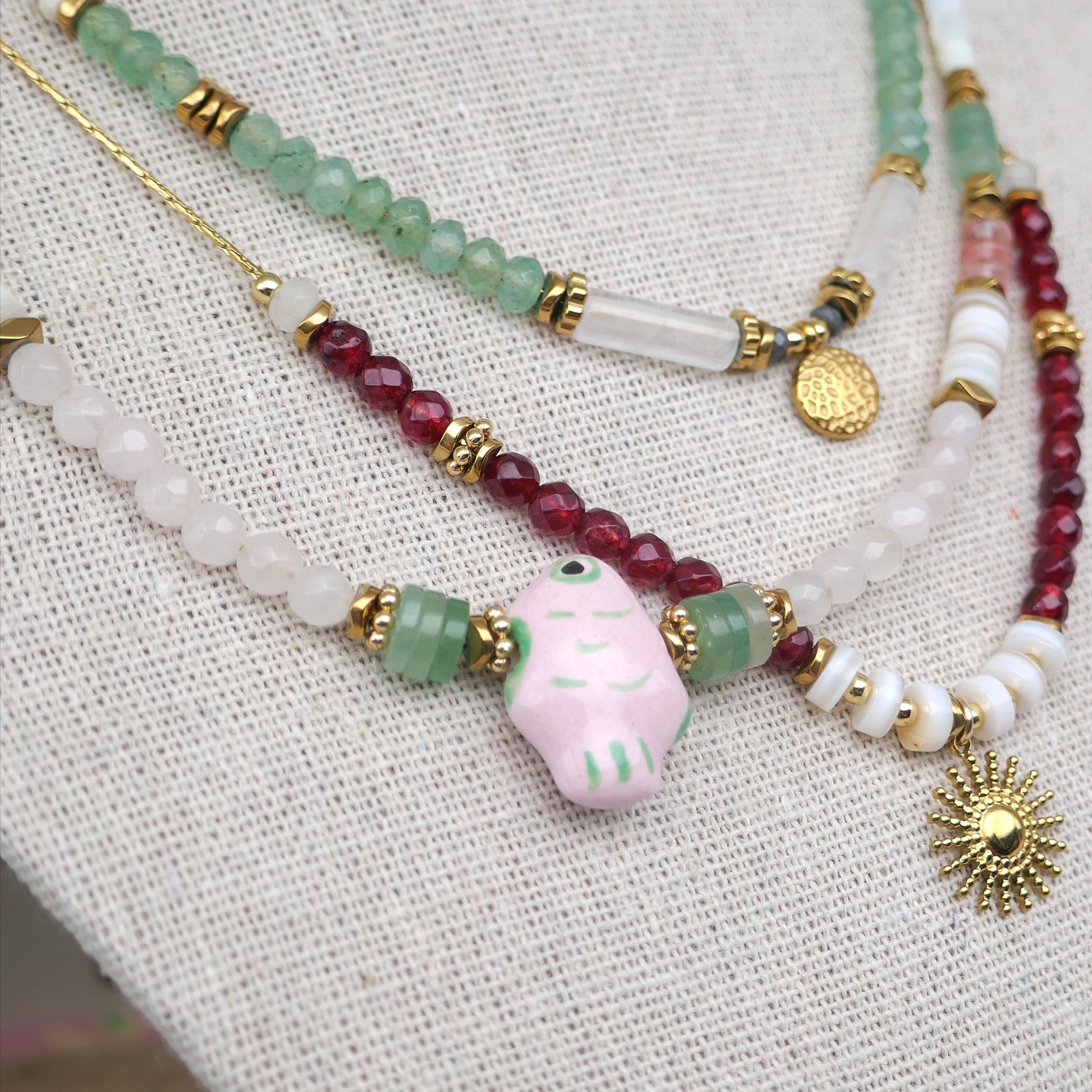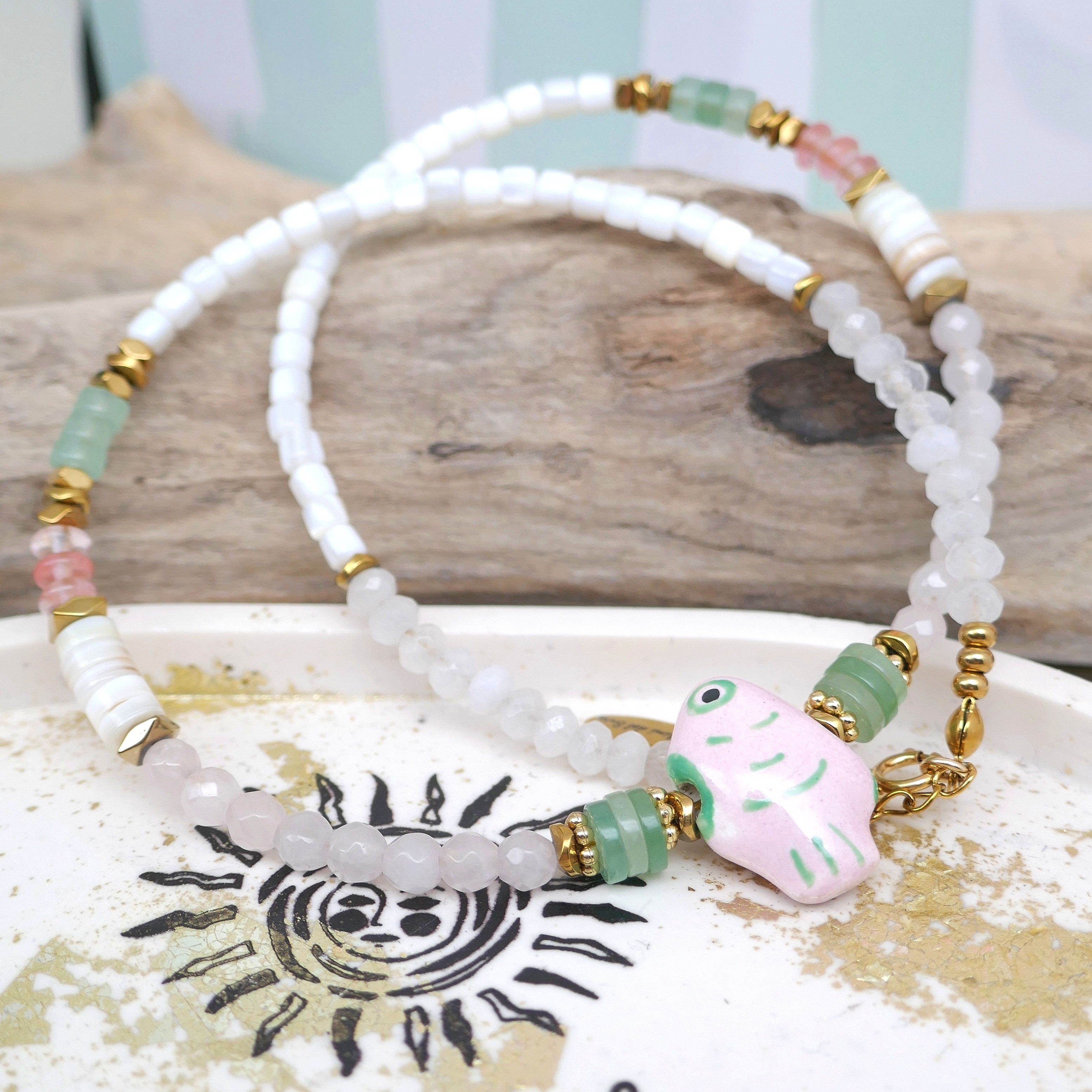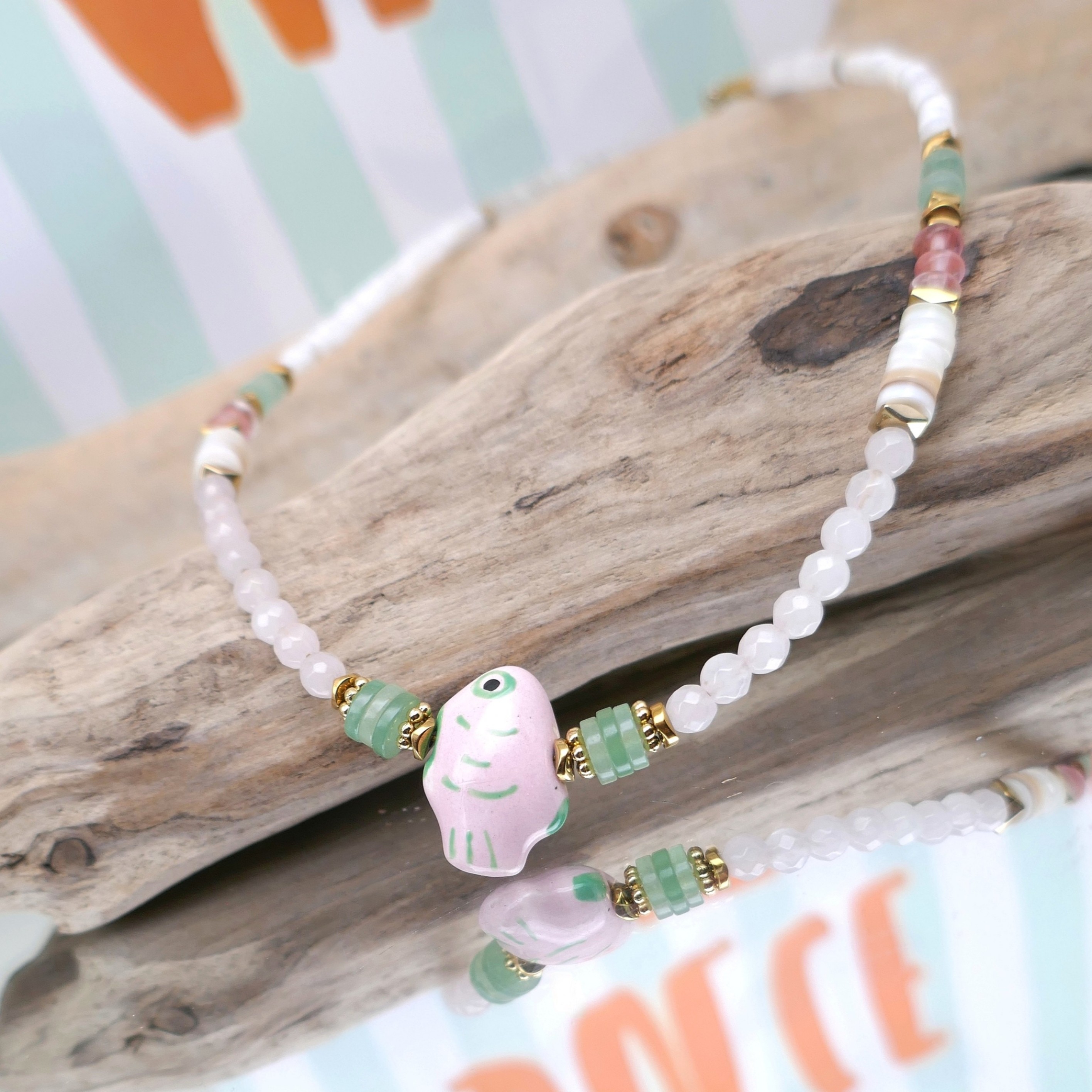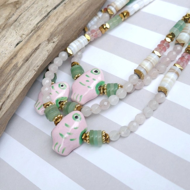 _ Mix de perles facettées en jade, coquillage, aventurine, quartz cerise...Poisson en céramique, intercalaires en hématite et acier... Chaque perle / pierre étant unique, il peut y avoir de légères différences.