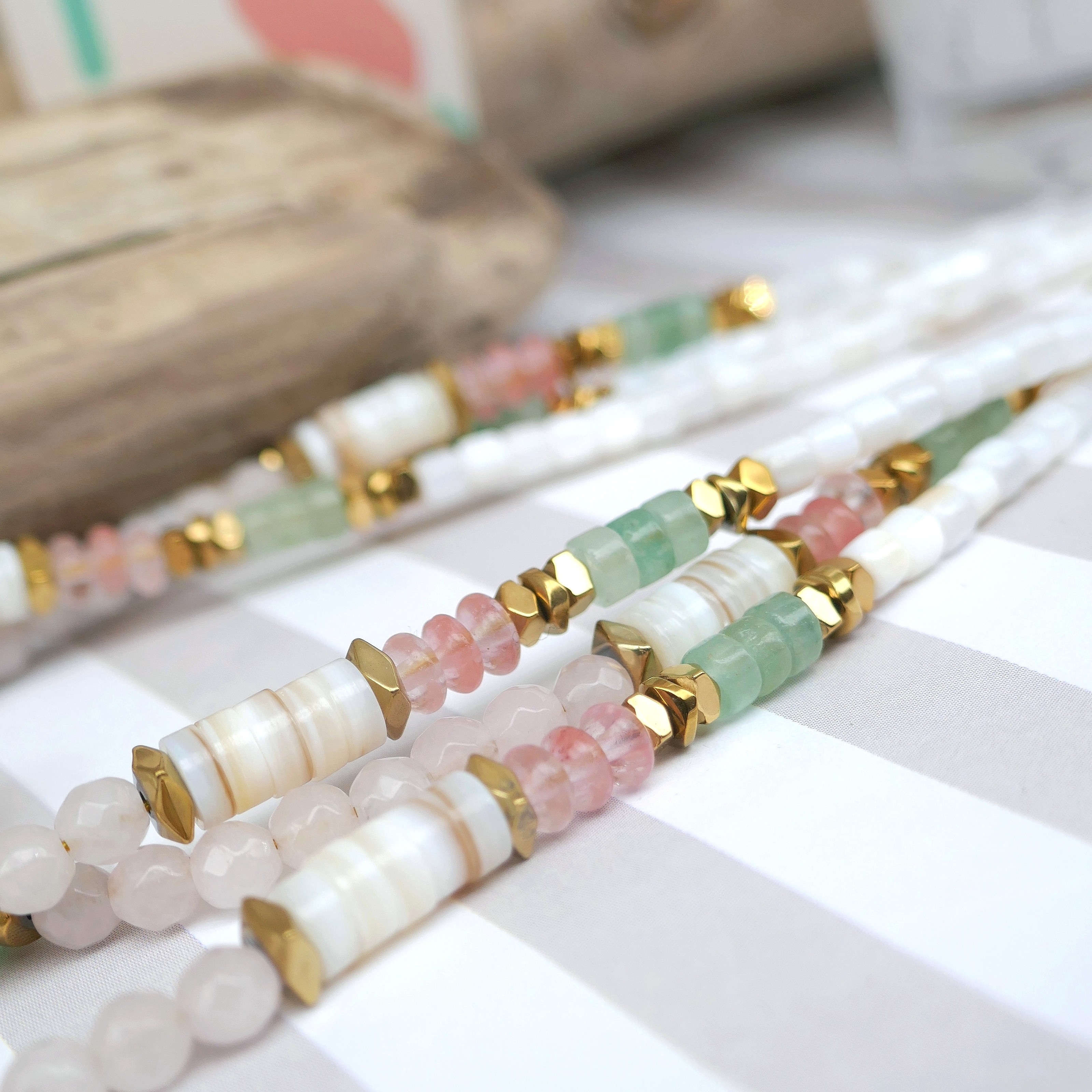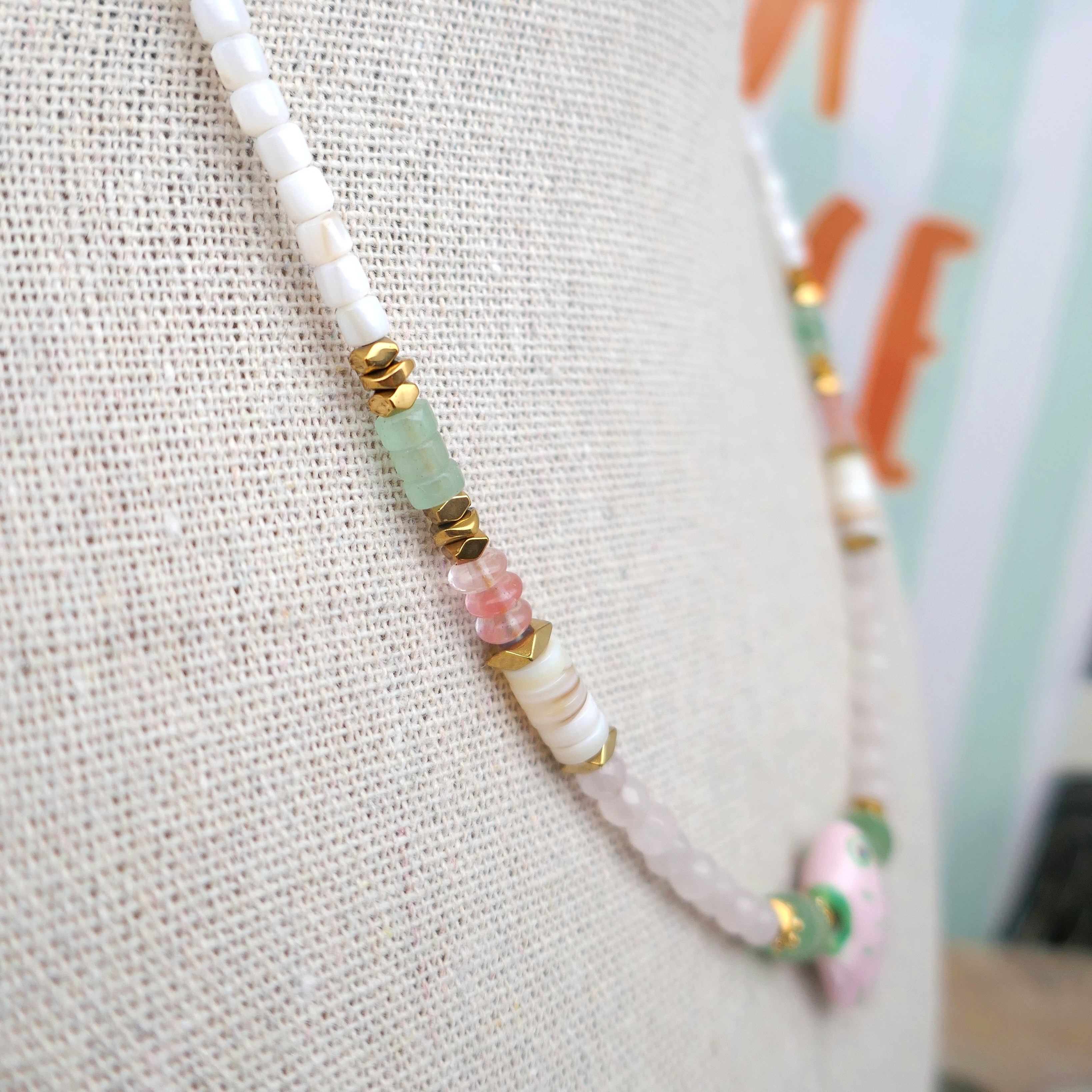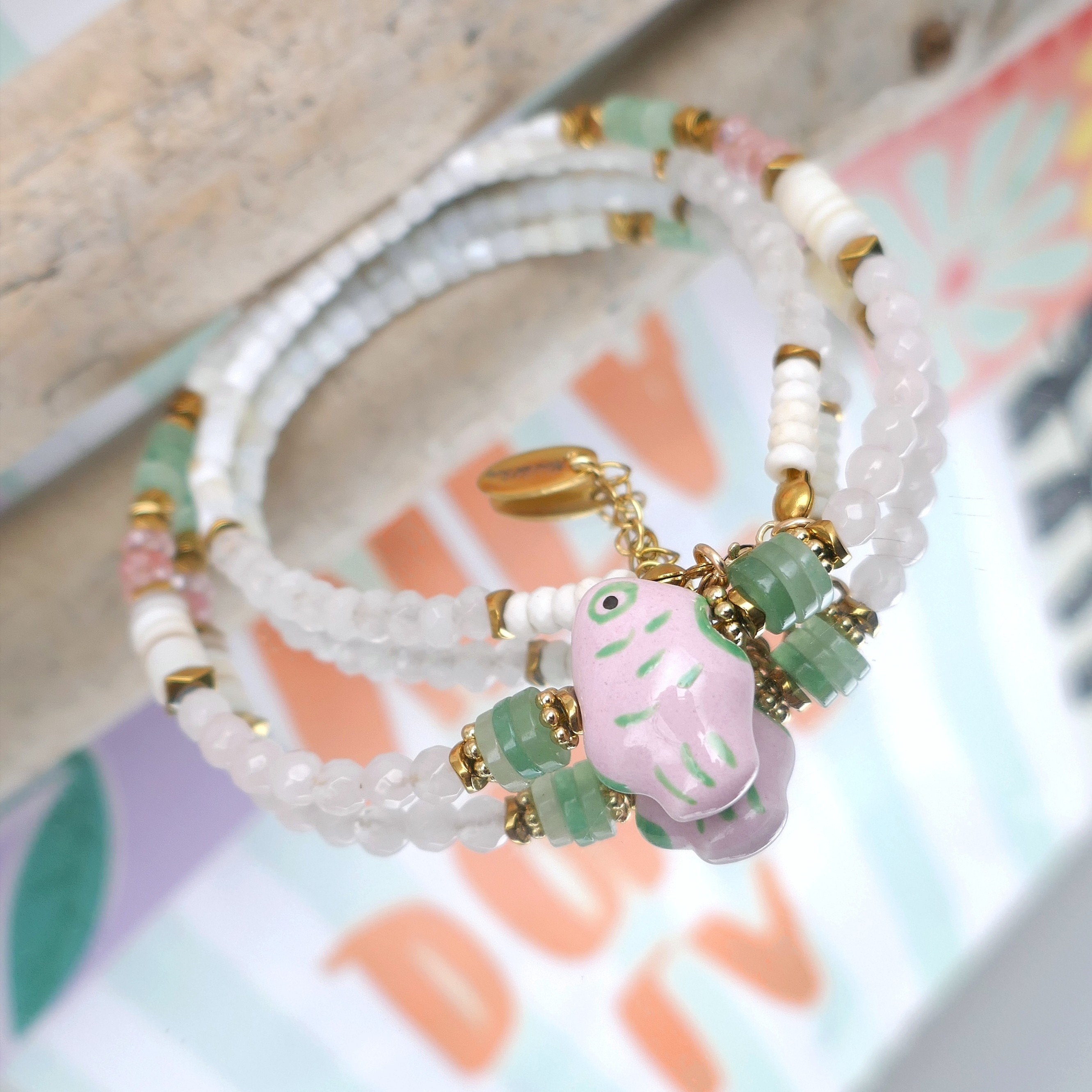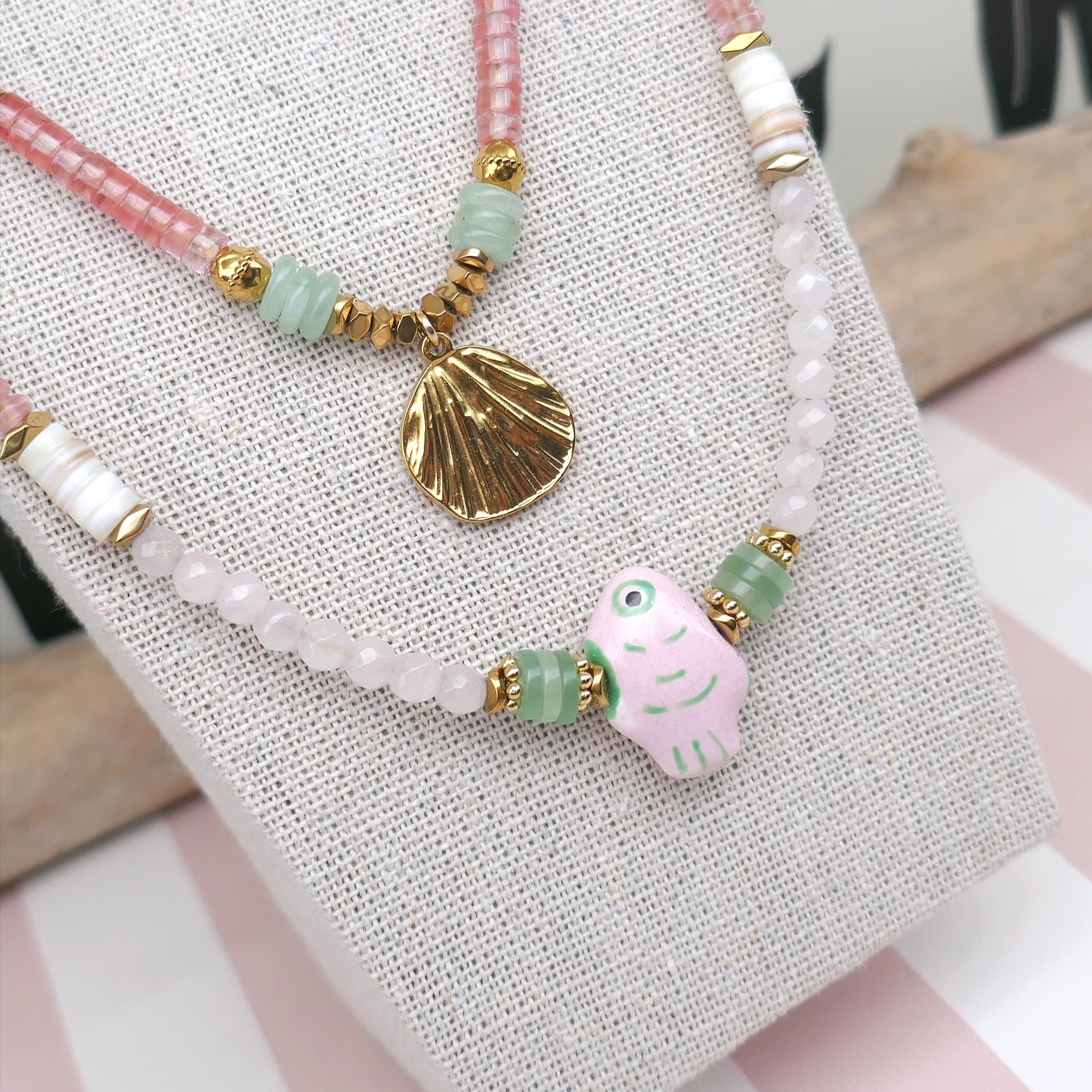 _ Mix de perles facettées en jade, coquillage, aventurine, quartz cerise...Poisson en céramique, intercalaires en hématite et acier... Chaque perle / pierre étant unique, il peut y avoir de légères différences.
